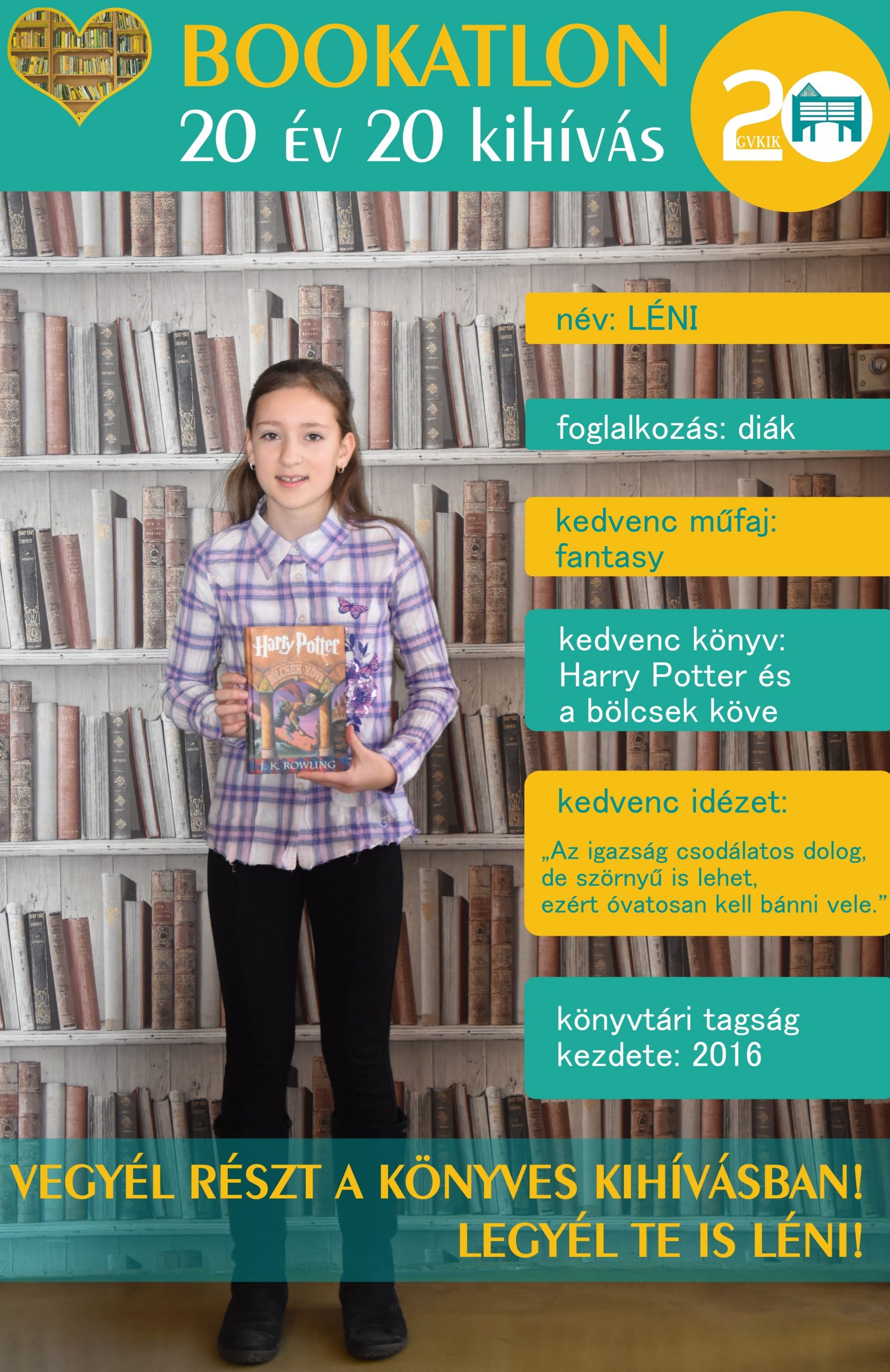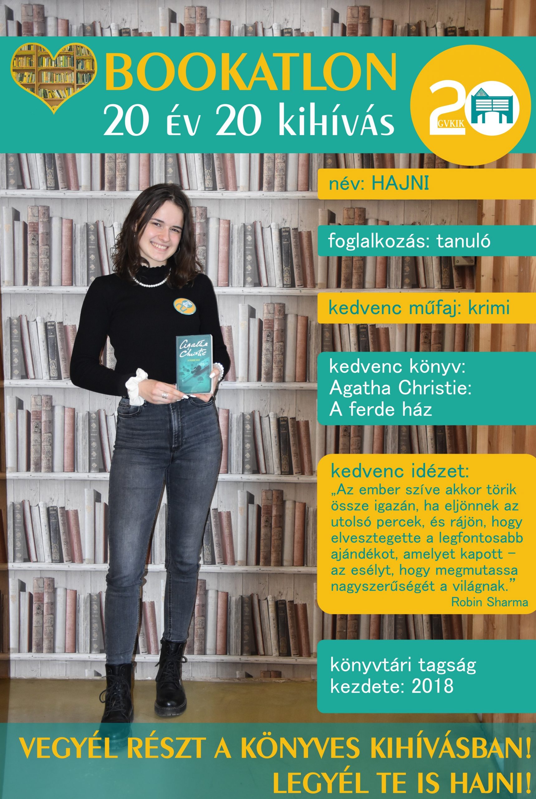 Bookatlon 20 év – 20 kihívás! Köszönjük, hogy ilyen sokan csatlakoztatok játékunkhoz! Természetesen folyamatosan várunk Benneteket, keressétek kedvenc könyvtárosotokat! Új játékosunk: Az egyik kihívás keretében …