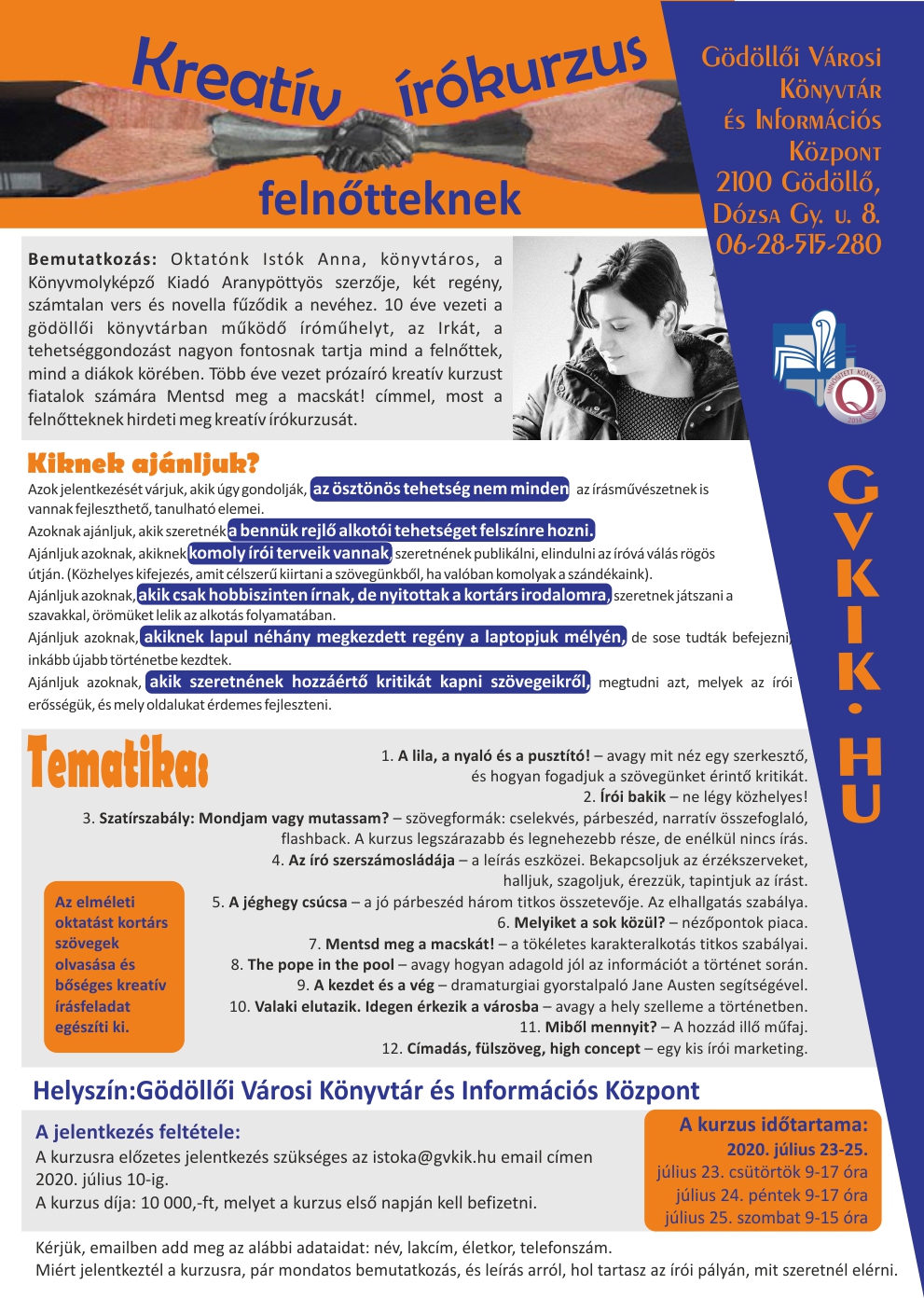 Oktatónk Istók Anna, könyvtáros, a Könyvmolyképző Kiadó Aranypöttyös szerzője, két regény, számtalan vers és novella fűződik a nevéhez. 10 éve vezeti a gödöllői könyvtárban működő íróműhelyt, az Irkát, a tehetséggondozást nagyon fontosnak tartja mind a felnőttek, mind a diákok körében. Több éve vezet prózaíró kreatív kurzust fiatalok számára Mentsd meg a macskát! címmel, most a felnőtteknek hirdeti meg kreatív írókurzusát.