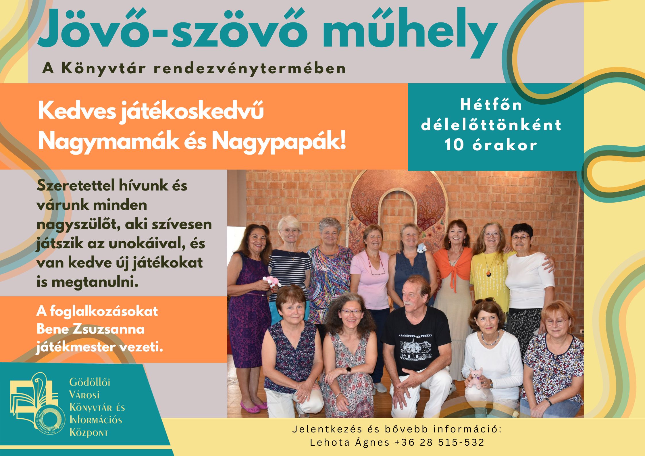A Jövő-Szövő Műhely 2019-ben alakult a Gödöllői Városi Könyvtárban. A műhely vezetője Bene Zsuzsanna, aktív éveiben a Damjanich János Általános Iskola pedagógusa volt. Most az Ad Hoc Színház tagja. A műhelyfoglalkozások alkalmával a gyakorló nagyszülőknek lehetőségük van olyan játékos technikák elsajátítására, melyek segítenek, hogy egészen kicsi kortól a kamaszkorig megtalálják a közös hangot unokáikkal. Álljon itt Bene Zsuzsanna rövid összefoglalója arról, hogyan született meg benne a műhely gondolata és miről is szólnak ezek az alkalmak.