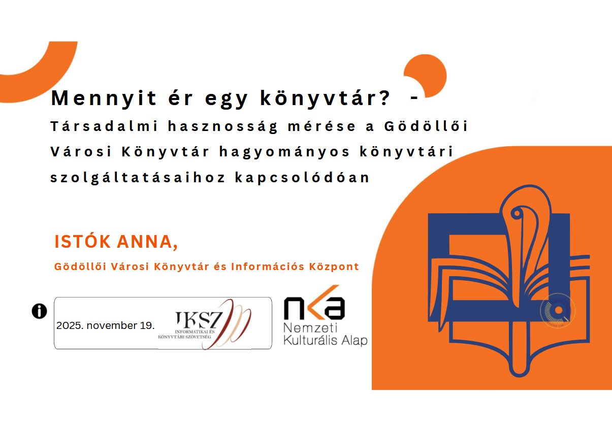 Mennyit ér egy könyvtár? - Társadalmi hasznosság mérése a Gödöllői Városi Könyvtár című pályázatában, konzorciumban együttműködő partnereinkkel: a Bródy Sándor Megyei és Városi Könyvtárral, (Eger) és a Verseghy Ferenc Megyei Könyvtárral, (Szolnok) közösen vállaltuk egy összetett mutatórendszer kidolgozását, mely általánosan alkalmazható benchmarking módszer a hazai könyvtárak számára, összehasonlíthatóvá válnak az egyes intézmények, és a mutató összetettségéből adódóan alkalmas lesz az eltérések okainak részletes elemzésére, ezáltal a szakmai fejlődésre, szervezetfejlesztésre. A mutatórendszer során kifejezett figyelmet fordítottunk a társadalmi hasznosság, Return on Investment számítási módszerének kidolgozására a lehető legszélesebb könyvtári szolgáltatási kínálatot alapul véve. Az egyéves munka eredményeit az alábbi előadásban foglaltuk össze, a témában további publikációt is tervezünk. Mennyit ér egy könyvtár?