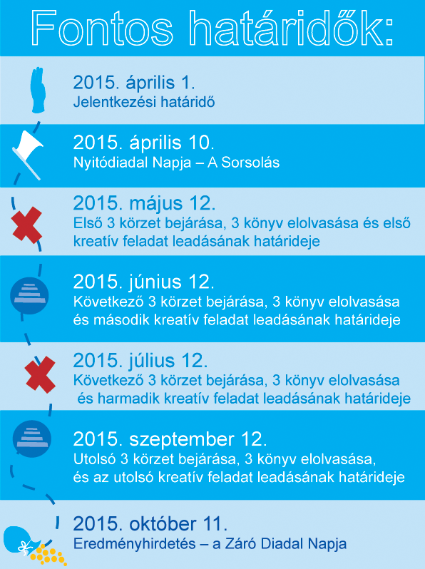 Tehát összesen egy csapat a Diadal során 12 könyvet kell, hogy elolvasson és minimum 4 kreatív feladatot megoldjon.