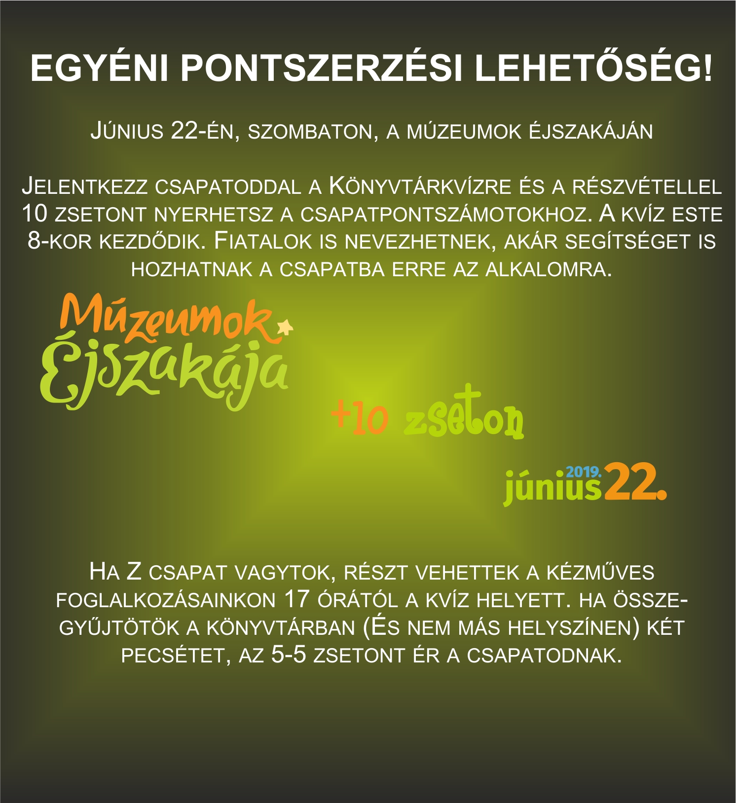 1. A Nyitó Diadalon sorsolt zsetonok már felkerültek az egyéni pontszámaitok közé, ezt minden csapat látja bejelentkezésnél: 1-2-3 zseton szerepelhet itt. A vetélkedő feladataiért járó pontok a generációs összesített pontszámba kerülnek, nem csapatpontszámok. Ebből fog kiderülni a végén: kik olvasnak a legtöbbet?