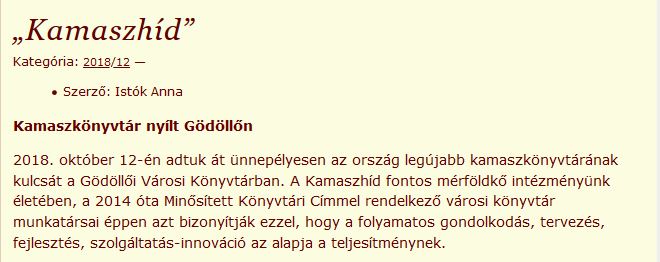 A Gödöllői Városi Könyvtár és Információs Központ Könyvtári Minőségi Díjat nyert 2018-ban. A két innovatív szolgáltatás bemutatásáról készült teljes pályzati anyag letölthető a képre kattintva.