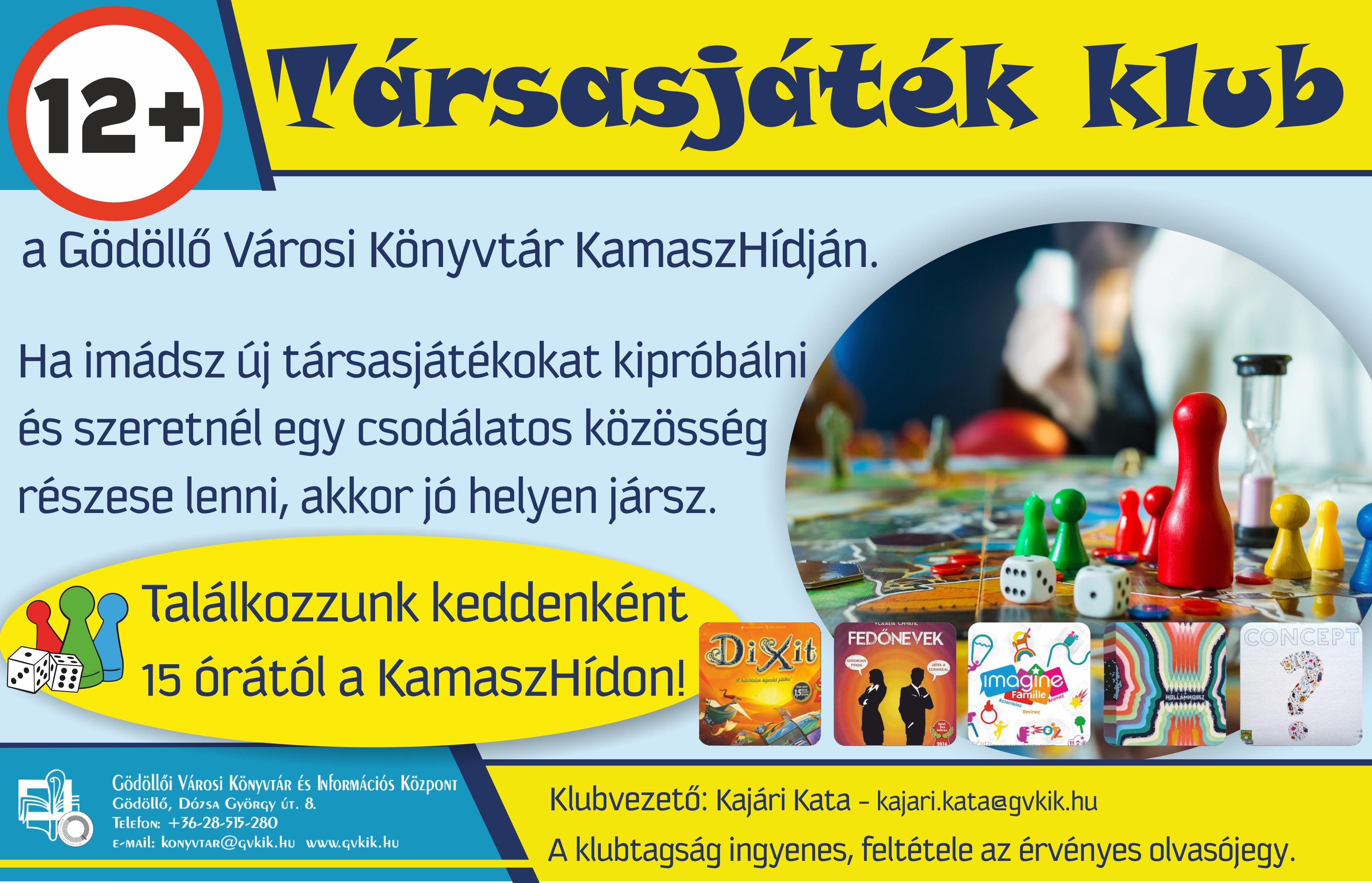 Légy játékban! Társasjáték klub kamaszoknakHa imádsz társasjátékokkal játszani és szeretnél egy csodálatos közösség részese lenni, akkor jó helyen jársz. Nálunk kikapcsolódhatsz, szerezhetsz új barátokat, és számos új társasjátékot kipróbálhatsz, amit játék után, ha megtetszett, ki is kölcsönözhetsz.