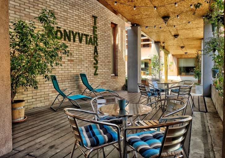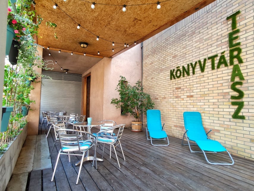 2019-ben kialakítottuk a Terasz Könyvtárunkat – a használaton kívüli teraszt felújítottuk, zöldesítettük, kényelmes bútorokkal láttunk el, és megnyitottuk a kávézó felé.
