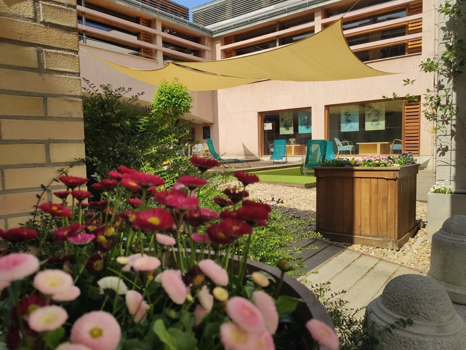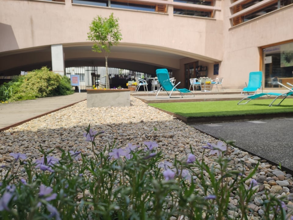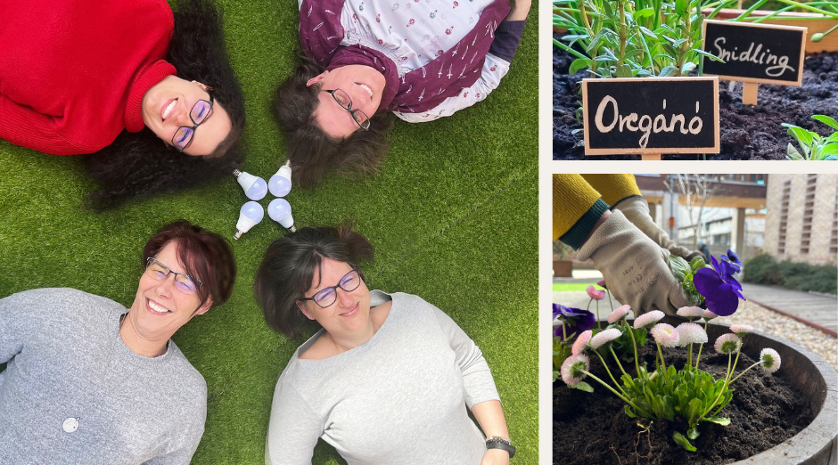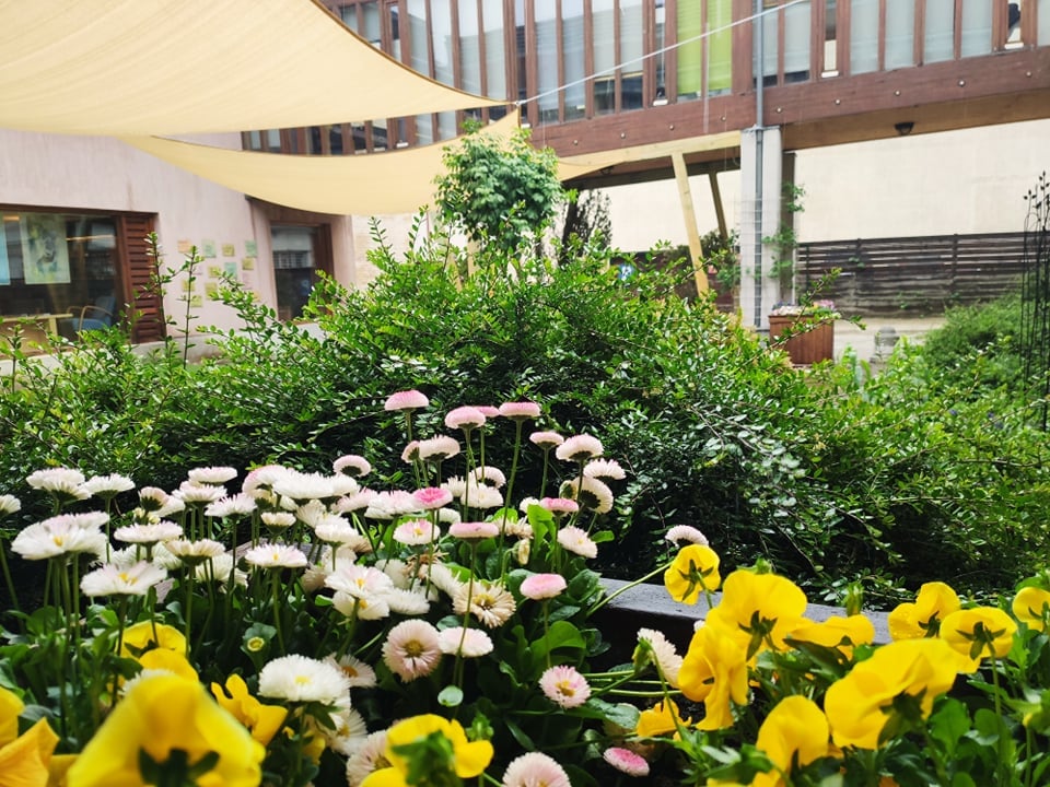 Le a cipővel! - Zöld udvar: belső udvarunkat zöld növényzettel újítottuk fel, kerti napozóágyakat, játékokat helyeztünk ki. Nyáron napvitorla, télen madáretetők lógnak a "mennyezetről".