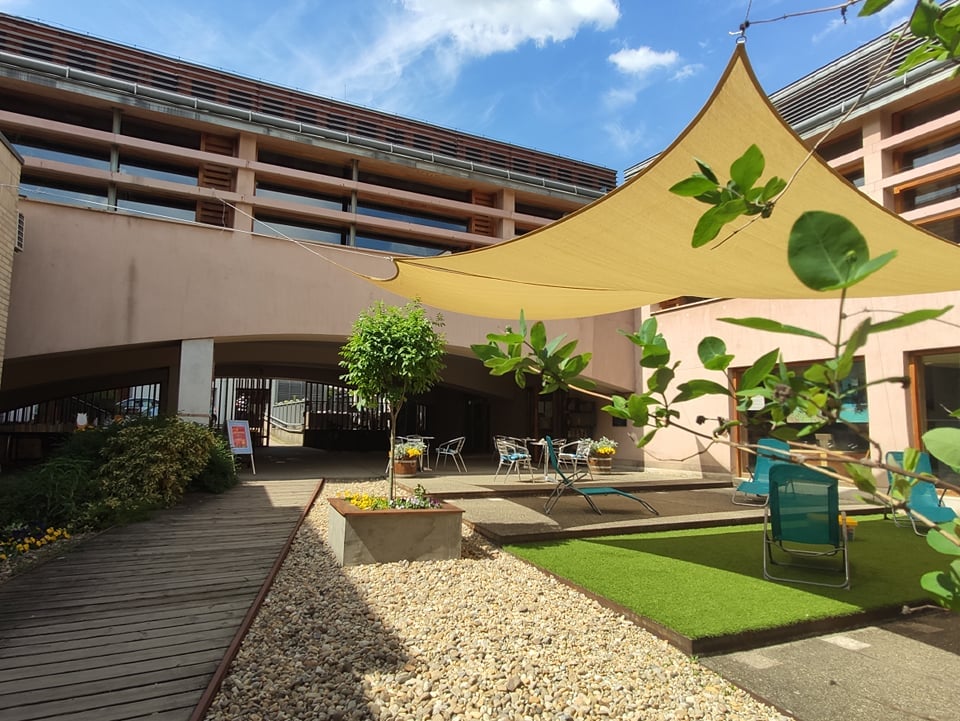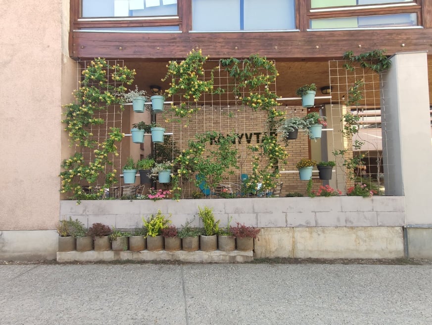 Szolgáltatásokat telepítettünk az udvarra és a teraszra: kivihető folyóiratok, könyvek, zenehallgatás, wifi. Nyáron a kellemes környzetben tartjuk irodalmi és kulturális programjainkat.